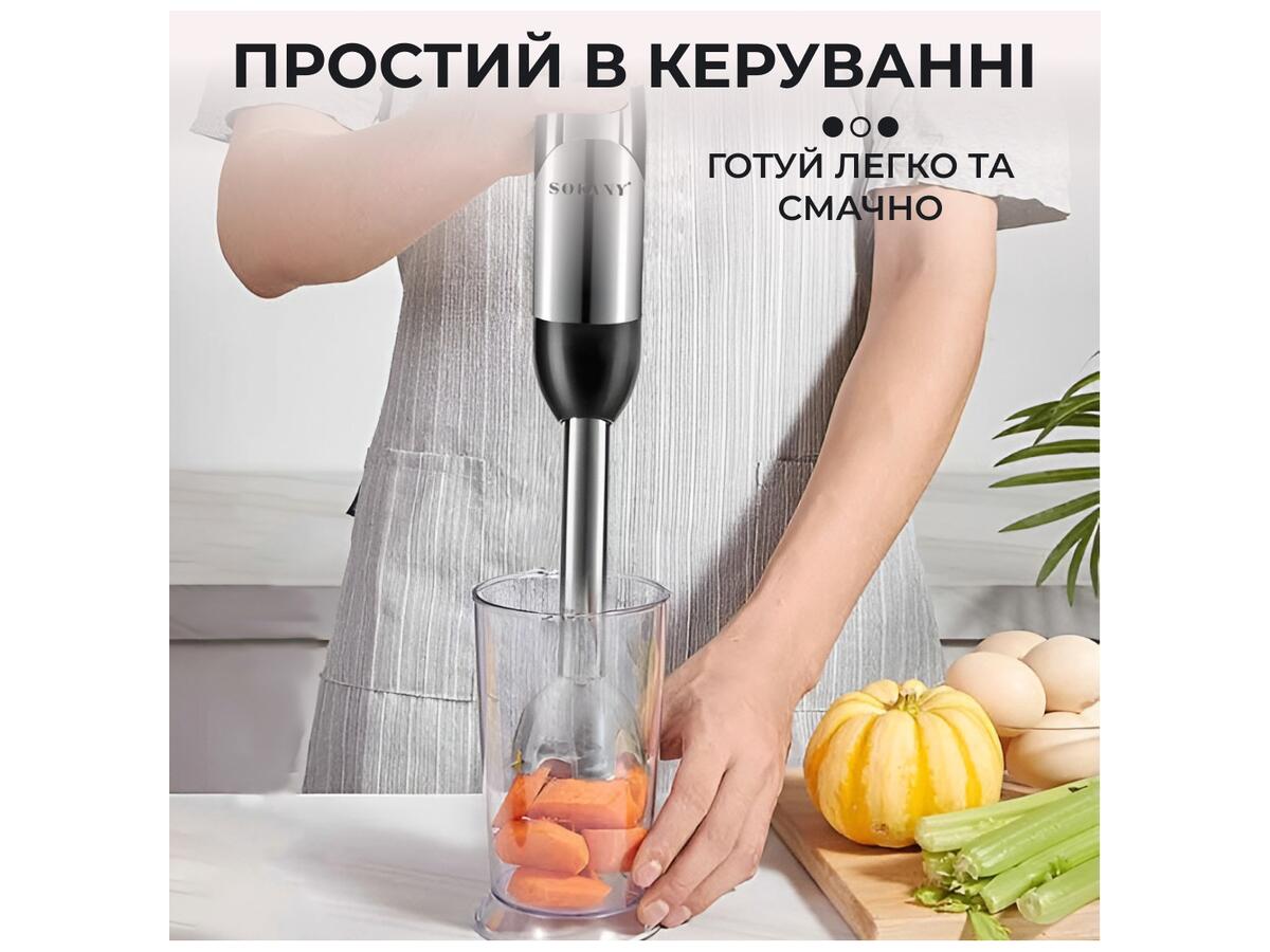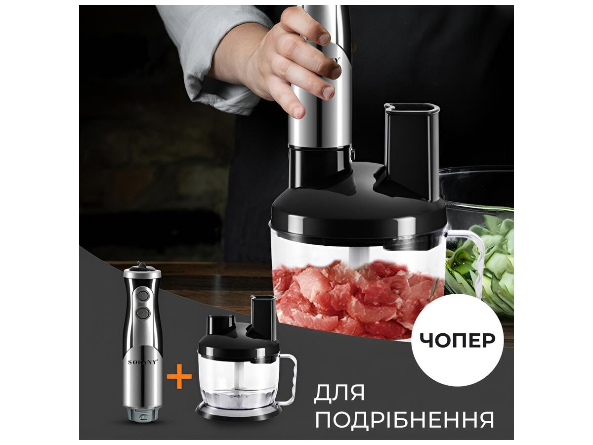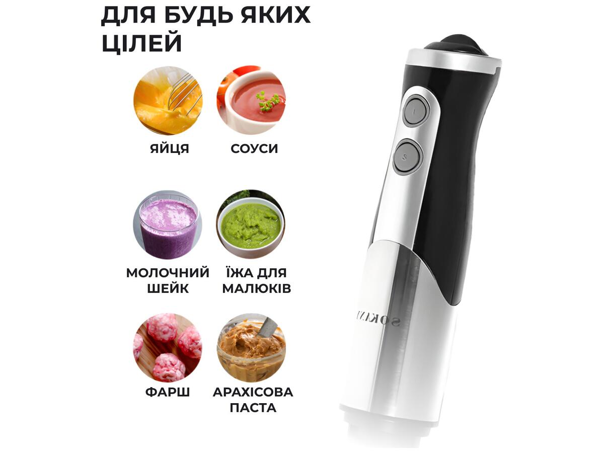 SOKANY SM-5011-8 — це потужний, надійний і універсальний заглибний блендер із багатою комплектацією. Він забезпечує виконання практично всіх базових кухонних завдань і водночас залишається компактним і простим у використанні. Чудово підійде як для повсякденного готування, так і для господарств, де важлива економія простору та функціональність в одному приладі.